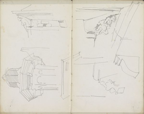 This drawing, "Figuur in een kerkinterieur," was created by Johannes Bosboom, an artist who lived in the 19th century. It is an intricate sketch of a church interior, its light graphite lines delicately articulating architectural elements. The composition, though seemingly fragmentary, offers a glimpse into Bosboom’s study of spatial relationships. The verticality of the church’s structure is explored through a series of lines, while horizontal lines cut across, forming a scaffold of visual planes. This creates a sense of depth and perspective, despite the sketch's unfinished nature. The juxtaposition of detailed sections with more gestural, open areas invites the viewer to complete the image, engaging with the creative process itself. Bosboom's choice of graphite is significant; its monochromatic quality emphasizes form and light, stripping away the distraction of color. This directness allows for a focus on structure and composition, highlighting the church's architectural presence. Through this stark, graphic representation, Bosboom captures not just a space, but a moment of contemplation. The sketch serves as an invitation to look beyond the surface, revealing the underlying framework of our perceptions.