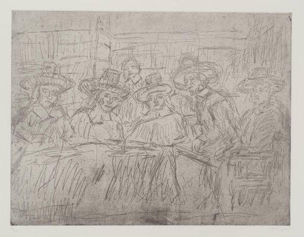 Editor: This is Paula Rego's "Drawing for 'The Dance'," currently residing at the Tate. It's like a sepia-toned memory, isn't it? A group of figures dancing, but there's a sort of haunting quality about it. What's your take on this piece? Curator: It's interesting you say "haunting." I see it, too. Rego often taps into the subconscious, the unsettling aspects of childhood and folklore. The blurred lines and the way the figures are both connected and isolated… It feels like a dream, doesn't it? Editor: Absolutely. Like a dream where things aren't quite right. Curator: Exactly! And that castle in the background, or whatever it is...it looms, doesn't it? A silent witness to their endless dance. It asks, what are they dancing away from, or towards? Editor: I hadn't thought about that. The background really does change the tone. Curator: It always does, doesn't it? Rego’s work is never just what it seems; it’s about what it makes you feel, what it stirs up from your own depths.