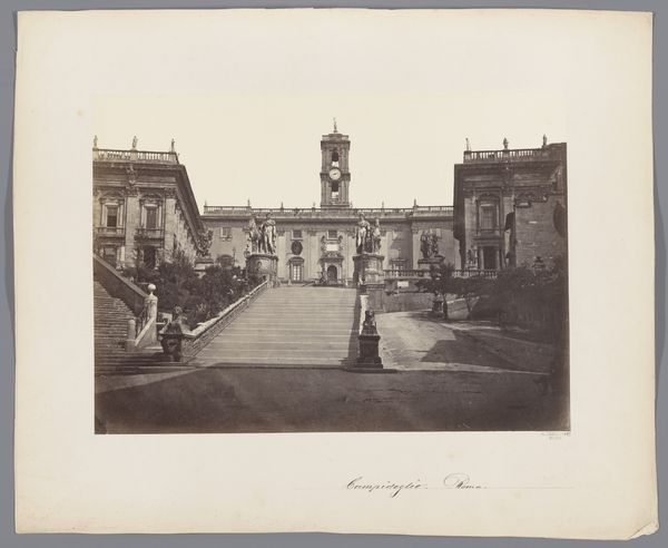 Editor: This gelatin-silver print, "Exterior of the Cathedral in Palermo and the statue of Rosalia of Palermo, Italy," is quite striking despite its muted tones. It appears to be from sometime between 1851 and 1900, with the photographer listed as anonymous. What do you see as key aspects of this image? Curator: Looking at this print, I'm drawn to how the gelatin-silver process itself impacts our understanding. The soft, almost ethereal quality flattens the space, minimizing the texture of the stone. Consider the labour involved in both the quarrying of the stone and the intricate printing process. Where did that stone come from? Who developed this photo and where were the materials manufactured? This image presents us with not just a scene but also the cumulative impact of production, and global exchange of materials required to document that scene. Editor: That's a really interesting way to think about it! It moves beyond just the aesthetic value and acknowledges the labor and resources. Curator: Exactly. Also notice the strategic choice to place Rosalia's statue alongside the Cathedral. This directs our attention towards the materiality of both, emphasizing their construction and signifying human intervention on landscape as expressions of devotion and control. What's highlighted through its very making and photographic interpretation is power of the church. Editor: I see that. Thinking about the print as a material object adds so many layers. Curator: It compels us to confront not only aesthetic value but also economic and social significance intertwined in its creation. In what ways is this labour absent from typical art history considerations? Editor: I will have to rethink my assumptions of what makes something art. Thanks. Curator: Indeed, and this is precisely where art begins for me, in asking, investigating and questioning how and why artworks come into existence.