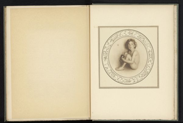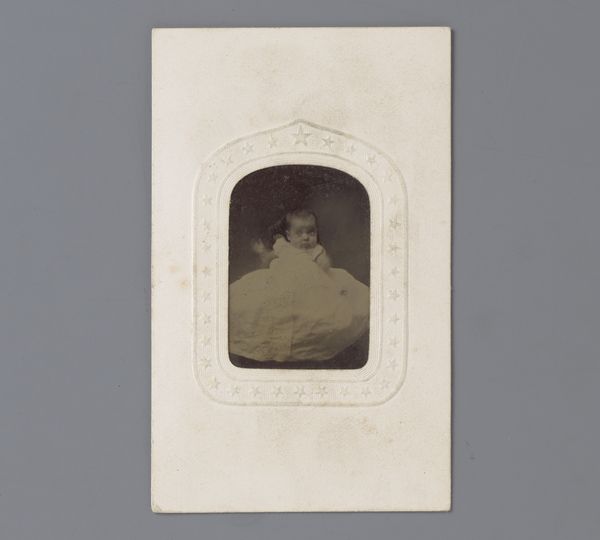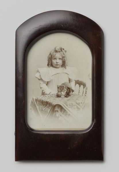 Editor: Here we have "Portrait of an Unknown Woman in a Chair" by Ferdinand Mulnier, made between 1866 and 1879 using albumen print photography. It's at the Rijksmuseum now. The woman's face is arresting but it’s her hands in her lap that hold my attention. What stands out to you in this piece? Curator: Note the tonal gradations within the oval frame. Observe the interplay of light and shadow which models her face, directing our gaze. Consider the subtle geometry of the chair's design versus the more organic forms of her body and dress. What is the effect of these juxtapositions? Editor: It almost feels like there are two portraits--the photograph within a photograph of the frame. The texture is striking. Curator: Indeed, the texture of the velvet frame and the smooth surface of the albumen print creates a compelling contrast, don’t you think? It draws attention to the photographic object itself, separate from its referent. Now consider the light; observe its direction and quality and how it defines the forms within the photograph. Editor: The way the light sculpts her face does make her the clear focal point. Almost sculptural, now that you point that out. Curator: Precisely. By observing these elements – tone, texture, composition – we can begin to unravel Mulnier's choices and, potentially, infer meaning from form. Editor: I hadn’t considered separating the woman *from* the photograph. Viewing it that way helps appreciate the photographer's technical and artistic decisions. Curator: The photograph here is a complex object: the photograph of a woman, set in an exquisite, velvet frame. Now, having deconstructed this piece, one is better prepared to grapple with it anew.