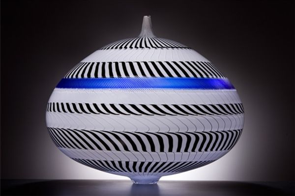 Lino Tagliapietra, born in 1934 on the island of Murano, Italy, crafted “Altare” from glass, a medium deeply intertwined with Venetian history and identity. Tagliapietra’s work emerges from a lineage of glassblowing artisans whose techniques were closely guarded, representing centuries of cultural heritage. “Altare”, with its layered, linear design, transcends traditional forms, reflecting Tagliapietra's innovative approach. The interplay of black, white, and blue striations creates a mesmerizing optical effect. The lines seem to both converge and diverge, hinting at the complexities of cultural exchange and identity formation. This piece evokes the fluidity of Venetian culture, a melting pot of influences from the East and West. While honoring ancestral craft, Tagliapietra pushes against its constraints, crafting an object that resonates with both the weight of history and the lightness of contemporary expression.