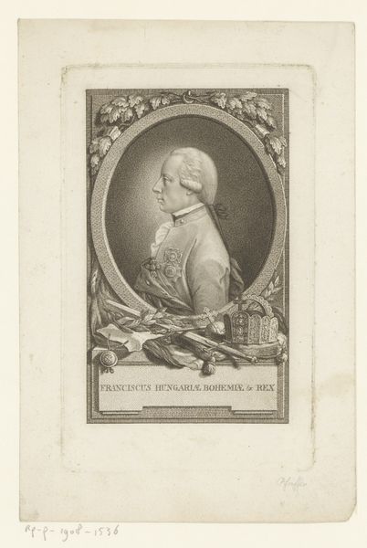 Curator: This is a print depicting "Portret van Jan Andries vander Mersch" created between 1790 and 1816 by Jean-Joseph Durig. It's an engraving and etching, currently held in the Rijksmuseum collection. Editor: My first impression? Dignified, almost stern. It's interesting how this medium creates such a formal atmosphere. The texture itself feels rather...official, wouldn't you say? Curator: Absolutely. Consider the emblems that surround the central portrait. The arrangement feels intentionally classical; Durig utilizes the imagery of honor and order through that. This symbolism represents vander Mersch’s role. Note the inscription and other accompanying items suggesting authority. Editor: Right. But think about the labor involved. The precision demanded by the etching and engraving process…It’s quite physical and repetitive work. Someone was meticulously transferring this image onto the metal plate, creating a matrix that could produce multiples of this important figure, and the labor must have had very particular societal class dimensions. Curator: Precisely. Prints allowed for wider circulation of images of authority and status. Each element of the composition is crafted to communicate power. His gaze is directed purposefully, his uniform speaks of rank. Editor: And the paper itself becomes part of that story! The texture of the paper, the consistency of the ink – these are materials that had to be acquired, prepared, and distributed. The material speaks of access, to some extent, who owned them, and the potential that these portraits were viewed with political alignment of sort. It suggests much broader socio-political currents to consider in relation to this subject matter! Curator: An interesting contrast with other Neoclassical artworks focusing on painting and sculpture. Here, the materials subtly reinforce a theme. The use of print connects it directly to ideas of civic responsibility. It makes me wonder who exactly purchased the prints of this artwork in 1790? Editor: And it’s interesting how an artistic print process that we’d label as a "medium" would influence social status! Both art and materials worked together. That in turn could influence one’s perception, depending on your background and life experience. The possibilities…it’s fascinating!