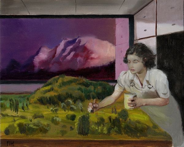 Editor: We’re looking at “Maiden Voyage,” an oil painting from 2006 by Bo Bartlett. The subject, a young woman, sits in front of a window framing a cruise ship and distant snowy mountains. There's something so staged and unsettling about the composition... How do you interpret this work? Curator: I see a deliberate construction of femininity and mobility. Consider the title, “Maiden Voyage” - it immediately suggests a journey, traditionally associated with adventure and coming-of-age. But the woman is indoors, passively looking out at a mode of transport associated with luxury travel. Doesn't it make you wonder who has access to the literal and figurative journeys represented here? Editor: Yes! It's like a separation or tension between actually going on an adventure versus just viewing the possibility from a distance. And there’s also the framing - the window almost acts like a painting *within* the painting, further distancing us. Curator: Exactly. It also begs the question of whose gaze this painting caters to. Is this about empowering female travel, or about reinforcing an image of women as objects of aesthetic contemplation, confined by societal expectations, despite the suggestion of opportunities beyond? Who gets to go and who watches? What kind of role does class play? Editor: So, the "maiden voyage" isn't just about physical travel; it’s a comment on women's limited roles, even within the perceived freedom of modern society? Curator: Precisely! It’s a historical painting that asks how images of women participating in or consuming mobility continue to be charged by earlier eras. Editor: I never considered those questions before. Looking at art through the lens of social commentary has broadened my perception. Thanks for sharing your insights. Curator: My pleasure. I’m always interested in seeing how art operates within power structures. There’s always more to discover by examining context and considering those left out of the narrative.