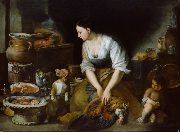Curator: Here we have "Bubble-blowing Girl with a Vanitas Still Life" dating from around 1680 to 1775. It is an oil painting and you can find this work in the Rijksmuseum collection. Editor: It strikes me as having a melancholy stillness. The dramatic light falls upon a small gathering of objects, anchoring a girl who seems to exist in an impossible simultaneity of youthful vivacity and mortality. Curator: Indeed. It is a visual contemplation of the fleeting nature of life. We can see van der Werff employs a common trope: a skull prominently placed at the base of the table to symbolize death. The violin, musical scores and seashell each stand in to show a worldy collection of passions. The soap bubble, of course, is ephemeral. Editor: Precisely! Its spherical form echoes the skull’s, yet suggests a transience made even more pronounced by the dark setting, which creates a sense of both compression and expansion. Van der Werff creates an interesting push and pull between its flat, pictorial surface and illusions of depth. Curator: The choice of symbolic elements points to Dutch Golden Age sensibilities—reflecting not only the anxieties about life’s brevity but perhaps hinting to the vanity of worldly pleasures versus the more profound realities of human existence. Editor: Yet the girl’s gaze and bubble blowing, brings it back to a different interpretation. The moment is both a memorialization and celebration. In a similar fashion, it's tempting to find fault with what can seem almost hyperreal. And this almost clashes with a baroque naturalism in the face of an inevitable flattening. Curator: Perhaps. But for contemporary viewers, images can still elicit multiple meanings that go beyond the original intent. The cultural narrative we construct can evolve over time, isn't that right? Editor: Perhaps the true meaning lies not in the individual symbols but in their interplay—how they engage our perceptions of change and timelessness, reality and representation. The very act of our looking changes how and what we believe about our interpretation of meaning, especially now. Curator: A poignant observation! "Bubble-blowing Girl" has an intimate visual language—it's truly intriguing. Editor: Yes, and those bubbles! Reminders of a fragile moment caught, just before it inevitably pops. Food for thought.