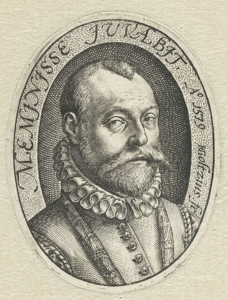 Editor: This engraving from 1579 by Hendrick Goltzius, “Portret van een bebaarde man,” has an incredible level of detail. I'm curious to know, what underlying symbolic meanings or messages do you find conveyed in this image, given your expertise? Curator: The eyes tell us so much. Notice how they lock onto ours. Goltzius, even in portraying another, imbues the gaze with an intellectual weight that compels attention, hinting at layers beneath the surface. Look closer: what feelings does it evoke in you? Editor: It’s a confident gaze, but also quite stern. The man's expression does make me think he is proud, but why? What does the text framing the portrait, “Dracht goetwillich tast met mannekens," add to the interpretation? Curator: The inscription suggests, "The willing power feels with little men." Perhaps referencing leadership. But think also of Goltzius's skillful burin technique as "willing power" that depicts or feels alongside the average citizen. Note that the beard itself was, historically, a powerful marker of wisdom and status. Do you see it connecting this sitter to an archetype? Editor: The beard does evoke classical philosophers, actually! It’s as if he's associating himself with that lineage. Curator: Exactly. And in doing so, Goltzius connects not just the sitter, but the very act of image-making with history. Consider the image as an accumulation of symbolic layers, built intentionally. What stays with you now? Editor: Seeing those connections makes it a far richer experience. Now I recognize how seemingly straightforward portraits can actually transmit meaningful and intricate messages about identity, status, and history. Thanks so much!