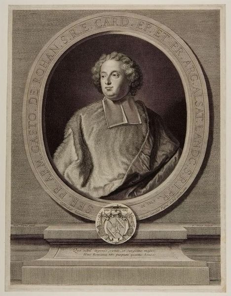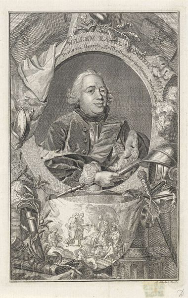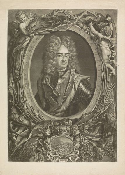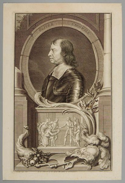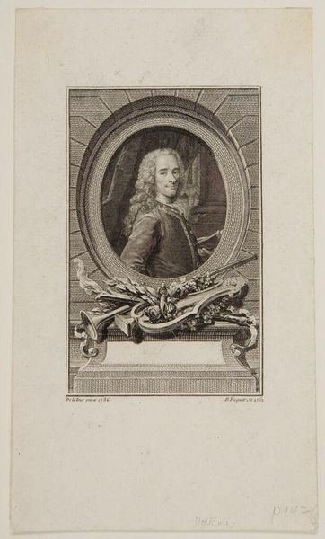 Editor: Here we have Jacobus Houbraken's portrait of John Dryden, currently at the Harvard Art Museums. The intricate detail is quite striking. What do you find particularly interesting about it? Curator: Consider the performative aspect of portraiture. Houbraken constructs Dryden's image, literally framing him within symbols of erudition and the arts: books, a lyre, even a theatrical curtain. It's a carefully curated presentation of intellectual status. Editor: So, it's less about capturing Dryden's essence and more about constructing a persona for public consumption? Curator: Precisely. Think about the role this image might have played in shaping Dryden's reputation and cementing his place in the literary canon. What kind of public image do you think he wanted to convey? Editor: That makes me consider how portraits function within the larger context of power and representation. Thanks! Curator: Indeed, observing this helps us understand how reputations are built and maintained through visual culture.