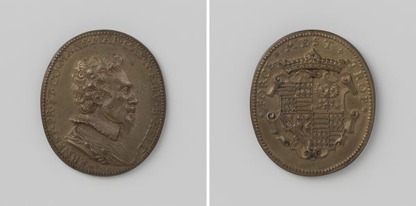 Editor: This artwork, created by Thomas Rawlins in 1649, depicts "The Beheading of Charles I, King of England" in a print made of metal. The details are astounding for something so small. What strikes me most is the contrast between the regal portrait on one side and what appears to be a chaotic scene on the other. What do you see in this piece? Curator: Formally, we must examine the dichotomy. On one face, the ordered inscription, the profile of Charles I, neatly framed; its texture refined, conveying authority. Then observe the reverse: jagged, disrupted space with a light source that reveals deep etching lines. The semantic content offers the starkest contrast; a symbolic rendering of Charles’s execution. Do you notice how Rawlins employs the circle as a formal device to contain both order and disorder? Editor: Yes, it's like a visual paradox! It's fascinating how the artist uses the material itself, the metal, to convey such different ideas through texture and depth. But, isn’t this approach divorced from its historical significance, though? It seems deeply intertwined with the political turmoil. Curator: The turmoil serves as the generative context, not necessarily the determinant meaning. Formal analysis allows us to investigate how the artist's choices create a viewing experience. The light, for example, isn’t merely illumination but signification of hope perhaps, in the face of violence? It could just be divine intervention. Does the arrangement of space itself offer a comment? Editor: That's a good point, I hadn't considered how the formal elements contribute to the emotional weight. This formalist approach sheds new light on understanding it. Thank you. Curator: Indeed. Every artistic decision, consciously or unconsciously, contributes to the overall structural system of the piece. A rigorous investigation can produce astounding understandings.