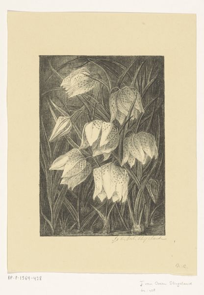 Curator: Immediately, I feel like I’m peering into some strange, serene, secret garden. The starkness of the black and white is so dramatic. Editor: And that's quite appropriate. We're looking at "Aronskelken", or "Calla Lilies", a 1919 linocut by Samuel Jessurun de Mesquita, currently housed here at the Rijksmuseum. It's a stunning example of his printmaking prowess. Curator: Linocut… which explains that incredible texture. It almost pulsates! What is it about calla lilies that captures artists, do you think? They're just so...stylized. Like nature performing theatre. Editor: Perhaps it’s the way they symbolize purity and rebirth, rising elegantly from the earth, seemingly untouched by the soil itself. De Mesquita manipulates the flower here in relation to themes of loss and conflict within a fraught political era, rendering it complex. Note the backdrop, and consider its emotional effect on us as the audience. Curator: Those vertical lines…they almost vibrate! It feels both modern and… I don't know, ancestral. Like standing in front of a tribal mask carved with ritual purpose. The calla lilies appear trapped, caught within that framework. Do you think this artist found a deeper connection between the flowers and rigid vertical symbolism of entrapment? Editor: Indeed, his work often wrestled with duality—beauty intertwined with something harsher. He explores mortality throughout his works by placing symbolic flowers such as lilies as stand-ins for life's ephemeral beauty, in juxtaposition to strict lines alluding to restriction or control. It’s a powerful contrast to be sure. The linocut medium enhances it, making those stark black and white oppositions almost…painful. Curator: So the image uses those lines to subtly indicate entrapment while juxtaposing those linear ideas with softer edges and forms... making an interesting connection for me between imprisonment and the delicate organic forms of the lillies. Editor: A perfect visual encoding. Well, it’s a powerful and moving work – I keep finding new things in it. Curator: Absolutely! Its deceptive simplicity holds a lot more weight once you start to unravel its layers.