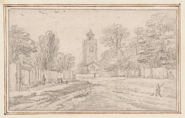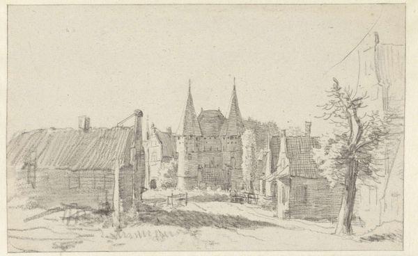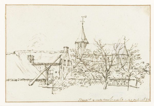 Editor: Here we have "St. Renelde (Saintes)," a pen and ink drawing possibly from 1676, attributed to Constantijn Huygens II. It's a delicate little cityscape, an etching that feels almost like a fleeting memory. What captures your attention in this piece? Curator: Well, aside from the utterly charming imperfection of it all – the slightly wobbly lines, the hesitant shading – I'm struck by the sense of intimacy. It feels like a stolen moment, doesn't it? Not a grand, commissioned portrait, but a peek into Huygens’ personal sketchbook. Do you get a sense of immediacy here? Like he just paused to capture something he saw every day? Editor: Definitely! The sketchwork gives it that personal touch. Curator: Exactly. I see Huygens finding beauty in the ordinary. The way the lines define the rooftops, the church spire, they almost dance across the page. What I also see is an embrace of what isn’t typically "art." There's an unfinished quality, an acknowledgement of process over polish. And honestly, isn't that sometimes where the real magic lies? The quiet confidence of a line, unburdened by perfection. I find myself wondering about what this view meant to Huygens. Did it stir contemplation? Nostalgia? Editor: It makes you think about the story behind it. Almost like a visual diary entry. Curator: Precisely! These intimate works offer a rare window into the artist's inner world, reminding us that art doesn't always have to shout; sometimes, it whispers the most profound secrets. Do you feel inspired to capture everyday beauty in your own way? Editor: Absolutely. It definitely reframes how I look at sketches now. Curator: Mine too.