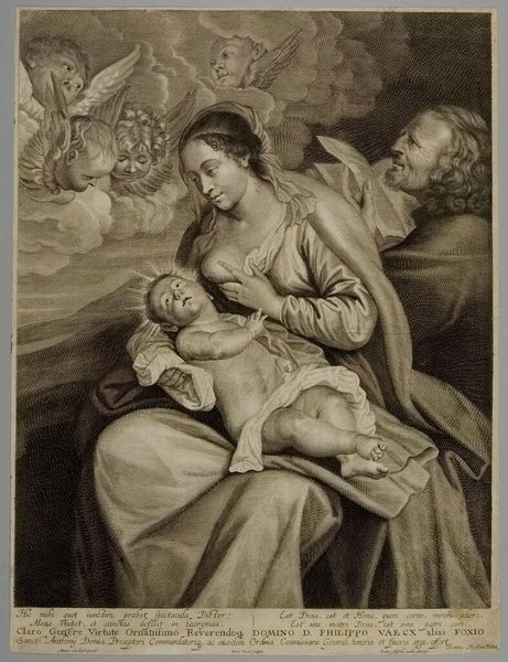Curator: We're looking at "Adoration of the Infant Christ by Mary and Joseph," a print made by Caterina Piotti-Pirola, who was active in the 19th century. Editor: What strikes me immediately is the pervasive sense of reverence. The figures are bathed in light, yet their expressions remain subdued, almost solemn. Curator: It’s fascinating how Piotti-Pirola translates this scene through the reproducible medium of printmaking. Consider the labour involved in carving those fine lines to create this sense of depth. Editor: Absolutely. The lamb, the angels, even the distant landscape, are all coded with layers of theological meaning and speak to cultural values. Curator: And the composition itself is a kind of cultural product, reflecting particular social arrangements of faith. Notice the contrast of the rough textures of the manger with the smooth lines of their garments. Editor: It's like a visual hymn. The halos are important as symbols of holiness, but what do you make of the light behind the buildings and hovering over the scene? Curator: It is truly incredible to consider how materials meet meaning. Editor: A wonderful reminder of the enduring power of images and their production in a historical context.