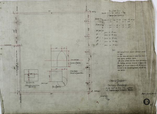 Curator: This delicate drawing, likely from sometime between 1891 and 1898, is a roof plan. It’s believed to be from the architects Adler & Sullivan for the Brunswick Balke Collender Company Factory Building in Chicago. You can see it’s rendered in graphite and ink. Editor: Wow, my first thought? Serenity. It's stark, geometric, almost like a Mondrian painting if he'd gone into architecture! I feel drawn to that clean, uncluttered design. Curator: Indeed! There is something deeply satisfying about the precision and clarity here. Each line, each square, serves a purpose. The whole is like a diagram of contained potential. For me, it is a symbol of modern progress. Editor: I see that too. Those precise lines speak of order, industrial potential...yet I sense more. There's an almost ritualistic element, the way those tiny arrows point inward. It feels almost as though it’s holding psychic energies in balance... Curator: A building as a vessel, you mean? In a way, that’s the work of Adler and Sullivan. The balance of form and feeling was deeply thought. Editor: Exactly! Looking at these little chimney stacks along the side, for example, it strikes me as more than a simple diagram. Think about what they would have looked like billowing smoke against the Chicago sky. Even in this plan, I feel the grit of the industrial age softened somehow. Curator: A romantic’s pragmatism? A businessman's aesthetic eye? Chicago really was the crossroads of those values. This simple plan resonates because it still asks questions about how those seemingly irreconcilable ideals work together, even now. Editor: Well, my headspace is a bit more “Jungian shadow,” but you're right, of course. What lingers isn’t the factory plan itself but the echoes of intent and aspiration – all that was to *happen* within these measured lines. That to me is the enduring resonance, beyond brick and mortar. Curator: Nicely put. Perhaps the beauty truly lies in its potent simplicity, waiting for life to unfold.