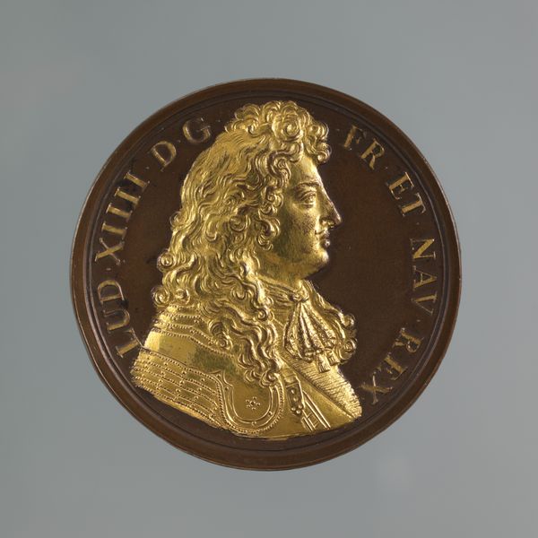 Curator: Here we have Jean Le Blanc’s relief sculpture, “Louis XV: Education of the King,” made in 1717. The circular relief appears to be constructed with a combination of brass and what looks like wood or a darkened metal. Editor: It certainly radiates authority. There's an immediate sense of rigid social hierarchy. Curator: Absolutely. Let's delve into the making of this piece. We can see the craftsmanship in the ornate brasswork depicting young Louis XV. The use of such costly materials—the gilded brass, the carefully crafted wooden base—speaks to the power and wealth concentrated around the monarchy. The labor that went into creating something like this tells a lot about the structures of power at the time. Editor: True, the means of production clearly underscore social class. Considering that context, how does the medium amplify themes of control? The subject, after all, is the king's education, and even here his power is literally cast into form. Curator: In terms of materials, this brass relief offered a relatively durable method for promoting royal iconography at the time, even compared to, say, portraiture on canvas, given its ability to be duplicated and disseminated. Moreover, it projects power because brass was seen as precious, and difficult to obtain. It's a very top-down depiction of not only royalty, but the idea of absolute control from a male point of view. Editor: Exactly, and the choice of rendering the king's effigy in metal points toward its lasting permanence, literally and metaphorically embedding itself in social consciousness. It almost feels like propaganda using the art medium as a tool of oppression. Curator: Precisely. Considering Baroque art of the period, this object presents interesting discourse. It highlights the socio-economic systems upon which it relies. Le Blanc gives shape to dominant power relations in 1717. Editor: Indeed. By examining this object so thoroughly, we're made conscious not only of the monarchy’s grip but the quiet forms of resistance we may enact against that power. Curator: Looking at it, I feel equipped with knowledge and understanding and thus inspired to think deeply about hierarchical systems around me, the intersectionality of class, gender and representation in material culture. Editor: Yes, I see now that the inherent political project of such a relief allows us to question how making processes might shape meaning and reinforce ideological beliefs about power and representation.
