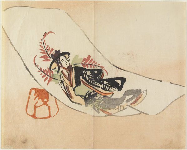 Editor: Here we have "Bijin in the Wind" by Kiyokata Kaburagi, a striking painting rendered with watercolor. The woman portrayed is elegant, yet the entire scene has an unfinished quality to it, with seemingly randomly placed foliage and objects in the background. How do you read the visual structure and semiotic elements within this composition? Curator: This composition utilizes a sophisticated interplay of line and form. Observe the strong, confident lines that delineate the figure against the more softly rendered background. The line’s crispness focuses the viewer's gaze, creating a hierarchy where the figure dominates, an effect that imbues significance to the cultural significance of the portrayed 'bijin' or beauty. What do you notice in the coloration? Editor: I see the vibrant color blocking. The red of her robe seems to almost intentionally contrast the faded background, though a unity does persist in how similar patterns are present throughout the image. The patterns also lead your eye to different parts of the frame. Curator: Precisely. Note the subtle use of color gradation within the garment—it guides the eye and introduces depth where minimal shading might flatten the form. The selective realism is vital here, emphasizing certain areas to suggest movement or to elevate them for the audience’s eye. Do you think this selectivity strengthens or weakens the piece’s message? Editor: I believe that the considered choices of selective rendering creates depth in an otherwise flat work; this amplifies the movement that captures the feeling of an ethereal instant. Curator: Indeed. By stripping away elements not critical to the expression of fleeting beauty, the artist forces us to confront what makes this ‘instant’ art, creating a space for prolonged observation. Editor: I appreciate your perspective, showing how this focus makes us really focus on that one singular beautiful point! Curator: My pleasure. It is often the choices that guide us towards deeper engagement and insight, inviting further examination.