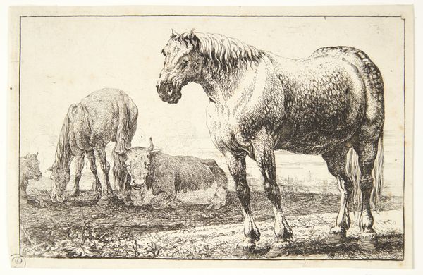 Curator: It’s hard to look at this etching without immediately thinking of the romantic era and its obsession with animals. Editor: Yes, and it's not just the period, but this one brings such a wave of stillness. I imagine a quiet summer day; lazy flies buzzing about, maybe the distant sound of church bells. Curator: Precisely! The artist, Adam von Bartsch, rendered this piece in 1796. Entitled “Horse standing on a meadow in profile to left”, it demonstrates a fascination with representing the natural world, common during this period of emerging industrialization. This print, created with etching on paper, captures the animal in a seemingly unburdened moment. Editor: There's also something slightly melancholic about him. Notice the downward gaze, almost shy. The artist captured a lot with so few lines. Did you know Bartsch was a curator himself? I can imagine him looking intently at ancient sculptures like this horse. Curator: Indeed. And perhaps that is part of what allows us to see the animal almost as a symbol here, a commentary on freedom but also labor within the broader social context of the late 18th century. We can consider class, labor relations and evolving agricultural practices of the era, to name just a few contextual touchstones. Editor: Or, you know, maybe he just liked horses! Seriously, there’s joy here too! The way the light falls on the mane. He's heavy, yes, a working animal maybe, but there’s a natural pride in his stance, no? He isn't just standing; he's _present_. Curator: A fruitful intersection between lived reality and idealized representation. Considering this print is now housed at The Metropolitan Museum of Art, it begs questions around labor and elitism and reminds us how power structures inevitably influence how we understand what "nature" is meant to represent. Editor: It’s all there. It’s a little window into a world long past, or maybe just another world. It makes you think, doesn’t it? About simplicity, nature, and, yes, everything we've discussed!