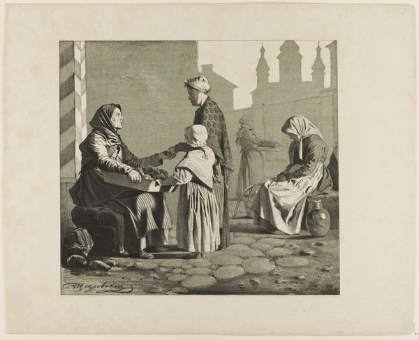 Curator: What strikes me immediately is the weightiness of these figures, cloaked in dense blacks and greys. Editor: I agree. And that sense of somber weight permeates Ignatii Stepanovich Shchedrovskii’s lithograph titled "Scenes from Russian Folk Life" presented in tones that evoke introspection more than outward action. The exact date of creation is currently unknown. Curator: Let's consider it's a lithograph, a printmaking process where the image is drawn on a stone or metal plate. The marks left behind signify a huge shift in reproducible imagery. Look at how meticulously he has detailed each texture; from the fabric folds to the man’s fur hat and coat. What was it like for Shchedrovskii, crafting this window onto Russian life for consumption? Editor: Good question. Situated as we are now, and noting the social stratification implicit in the image - a merchant, perhaps a monastic figure, and what looks to be a vendor--it's difficult not to wonder about Shchedrovskii's intent. To what extent was his artwork created to serve and reinforce Tsarist authority by aestheticizing divisions, and how did that intersect with his status in 19th-century Russia? Curator: His realistic style also seems to point toward making the ordinary accessible, yet it’s framed by the printing processes available at the time which would shape its accessibility differently for different groups. Mass reproducibility also affects consumption—did this artwork reinforce social positions through its very existence as an image meant to be replicated and viewed? Editor: Certainly. Consider too the setting—is it symbolic? The backdrop, while roughly sketched, hints at some urban architectural facade which contrasts starkly with what appear to be deliberately emphasized faces to explore those physiognomic elements deemed stereotypically “Russian.” This invokes debates on the gaze itself within power structures shaping racialized narratives during the period Curator: Absolutely. I see it too—how this artistic approach presents the act of seeing, and the materials and mode of production give way to complex discussions around class, labor, and representation. Editor: These details are pivotal. They ground the piece historically while allowing for open reflection about visual language within broader cultural contexts related specifically toward constructions on identity politics that defined imperial Russia—it really leaves much for pondering even today!