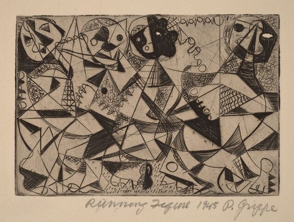 Peter Grippe created "Bicycle Rider" in 1945, a small etching which vibrates with energy. Grippe was deeply affected by the rise of Fascism in Europe and the subsequent war. His images often reflect themes of alienation and the dehumanizing effects of totalitarianism. The cubist style hints at simultaneity and movement. Each block contains a geometric rendering of a face and the spokes of a bicycle wheel. The rider appears multiplied, as if caught in the act of propelling forward. This abstraction creates a sense of emotional distance, but also speaks to the fragmentation of identity experienced during times of conflict. Despite the trauma of world events, Grippe seems to emphasize the need for the individual to press on. The bicycle becomes a symbol of resilience and forward motion, pushing against the forces that seek to immobilize. "Bicycle Rider" captures a moment of striving in the face of overwhelming odds.