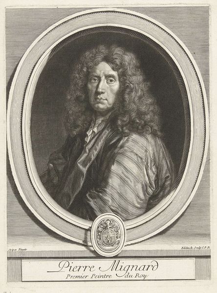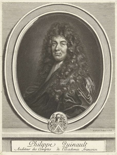 Curator: I find myself immediately drawn to the soft lines in this engraving. The sitter seems approachable despite the formality. Editor: Indeed. What we're looking at is a print dating sometime between 1666 and 1707, titled "Portret van Claude Perrault". It was made by Gérard Edelinck, and it’s currently housed right here at the Rijksmuseum. Curator: Perrault, of course, was a fascinating figure, deeply entwined with the French Academy and the court of Louis XIV. Beyond architecture, his work intersected with debates about science, knowledge, and power. You see how he’s literally framed, encircled by his academic affiliations? It speaks to the constricting yet also defining role those institutions played in shaping intellectual life. Editor: And look at the inclusion of that intriguing emblem at the bottom of the oval, that almost alchemical-looking lamp. The text included is a reminder that even if one illuminates things it is in order to better understand but not necessarily in order to better express oneself, it is a way to be discreet about things in life, but to still be capable. A really lovely subtle hint to a quiet life, an intentional visual message here for us to decode. Curator: Absolutely. Consider that alongside the opulence suggested by his clothing. It's not simply about individual portraiture; it becomes a statement about status, merit, and the construction of identity within the French court system. Editor: I also observe a tension in his gaze, caught somewhere between worldliness and inner thoughts. Is it complacency or gentle contemplation that defines this moment, I wonder? What story could we read from this almost imperceptible shadow across his eyes? Curator: To understand him historically we have to read everything: how portraits of figures like this served to legitimate a particular regime, a specific form of power… the very deliberate use of clothing and style. Editor: A lot here asks us to question the values of the past as reflections in today's society. Curator: Indeed, and even more pertinent if we bring current dialogues around academic validation, the social construction of genius and knowledge into view when considering its cultural worth. Editor: Precisely, a world of symbolism inviting continuous exploration.