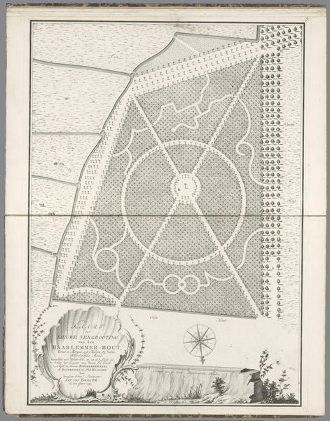 Editor: This is the "Plattegrond van de Haarlemmerhout," a print made with ink on paper by Hendrik Spilman in 1769. It looks like a very detailed, almost scientific map of a park or estate. What is striking to me is the imposition of geometry on nature, particularly the contrast between the structured gardens and what looks like a more natural wooded area. How do you interpret this tension? Curator: The tension you've observed is absolutely central. Consider the historical context. By 1769, the Dutch Republic was already in decline, its golden age a memory. This "Plattegrond" speaks to the desire to order and control the natural world, mirroring the political and social aspirations of the time. Can you see how the visual language, like the precise lines and geometric shapes, projects a certain image of power and refinement? Editor: Yes, I can see that now. It's like the map itself is a statement of ownership and control, a visual claim on the landscape. And the coats of arms, are those further affirmations of status? Curator: Precisely! These symbols locate the landscape within a very specific social hierarchy. It also presents the Haarlemmerhout not simply as a geographical location, but as a curated space invested with political meaning. I wonder, how does viewing this image as a tool of socio-political representation rather than just an aesthetic object shift your understanding of its artistry? Editor: It changes it completely! I was initially focused on the aesthetic contrast, but understanding its socio-political function reveals a power dynamic I hadn’t considered. It makes the artwork seem almost like a propaganda piece, showcasing the wealth and control of the elite. Curator: Exactly! What started as a beautiful landscape transforms into a reflection of complex power structures. Editor: Thanks, I never thought about landscapes being political! Curator: That's the beauty of looking through a historical lens. We discover how art actively participates in shaping the public's understanding of society.