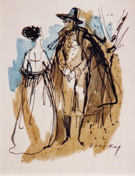 Editor: Henri de Toulouse-Lautrec's "Artillerman and Girl," created around 1886, renders a rather peculiar scene with watercolors on paper. It's stark, almost confrontational, especially with the subjects' gaze. How should we interpret this ambiguous dynamic, in your view? Curator: It's easy to get caught up in the "who is who" when viewing this, but let's step back and consider Toulouse-Lautrec's world. Think about the Parisian social scene, the cabarets, the military presence—it's a world of class tensions, emerging consumer culture, and gendered expectations. So, how might the artist be engaging with these tensions? Does the depiction subtly reinforce or perhaps critique them? Editor: That’s interesting, I hadn’t thought of it in relation to consumer culture. The subjects seem somewhat detached, and it reflects back on the socio-political contexts of that era. It makes me wonder about his intentions regarding their representation. Curator: Precisely! Lautrec was moving in circles that included both the bohemian underbelly and the aristocracy. What commentary might he be making about power dynamics? About who has the right to look, to judge, to be portrayed? The loose brushstrokes, almost like glimpses, also speak to a certain voyeurism. Editor: That rings true. Perhaps it’s about the fleeting nature of encounters within that world? The incomplete nature of the image reflects the transient experiences they portray? Curator: Exactly. This wasn't just a portrait; it was a statement. This artwork encourages us to reconsider our assumptions about portraiture and the society it reflects. We must consider the historical factors surrounding Lautrec and his world to help understand how this fits into those conversations. Editor: Thinking about art in its social and historical context opens up a completely different understanding of this image!