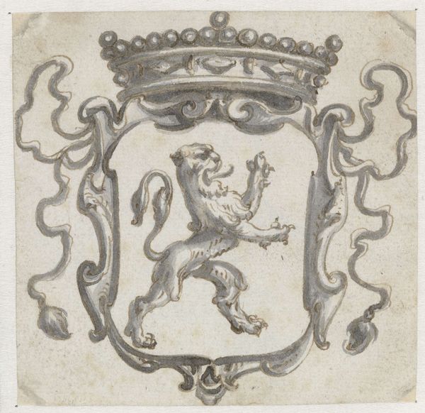 Editor: So, here we have "Bekroond wapenschild met een klimmende leeuw"—a crowned shield with a climbing lion—rendered in pen and ink sometime between 1630 and 1672 by Pieter Jansz. It's giving me "Game of Thrones" vibes, but like, if it were drawn by someone who was also doodling in their notebook during a really boring history class. What's your take? Curator: Oh, I love that, the bored history student reimagining Westeros! I see it too. For me, this drawing vibrates with a certain… potential. It’s not just a heraldic image; it’s an *idea* of one, captured mid-thought. See how the lines waver and flow? It’s like the lion is about to roar, or maybe even…leap off the page and rewrite its own story? I wonder, what do *you* think it was like to wield that pen back then? Editor: Hmm, wielding the pen... Maybe the artist was envisioning who this coat of arms was for – picturing them in their finery, ready to claim their power? All that swagger translated into a single leaping lion. It’s interesting how something meant to be so rigid and official feels so...dynamic. Curator: Exactly! It's officialdom trying to break free from itself. The Baroque period loved that tension. These pen strokes, they weren't just outlining a shape; they were breathing life into an emblem. Each flourish a little rebellion against the strict rules of heraldry, don't you think? It’s like Jansz is whispering, "Even lions need to stretch their legs." Editor: I love that. It definitely changes how I see the piece; not just a symbol, but a snapshot of an artist bringing a symbol to life, breathing a little rebellious swagger into it. I'm definitely going to look at Baroque art differently now. Thanks! Curator: And thank *you* for seeing the Westeros in it! Sometimes, all it takes is a fresh eye to unearth the story a drawing’s been waiting to tell.