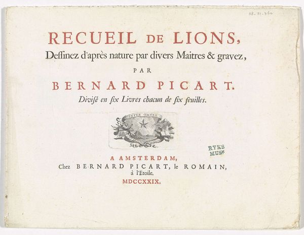 Curator: Examining this print by Bernard Picart, "Explication des Vignettes de la Seconde Edition des Oeuvres de Boileau," from 1729 at the Rijksmuseum, I immediately perceive a stark visual declaration. It seems less a decorative title page and more of an assertion of intellectual property. Editor: My initial reaction aligns with your observation about asserting intellectual ownership, but I’d add that its directness speaks volumes about the burgeoning print culture of the era, particularly within Amsterdam’s commercial milieu. How were prints like this viewed and consumed in society at that time? Curator: That's a vital question. In the social context of the 18th century, works such as this would circulate among the intellectual elite. We can interpret Picart's stylistic approach—a blend of Baroque dynamism and academic rigor—as catering to a learned audience concerned with both aesthetic appeal and intellectual authority. The vignette explication promised revisions and new designs in Boileau's works, a claim of significance for the republic of letters. Editor: Absolutely. The academic quality is notable—and undoubtedly affects how it was originally received. And this second edition status signals the growing importance of revisions, commentary, and accessibility in literature’s public role. Could we also analyze the implications behind Picart naming himself as part of the publishing house address on the title page? Curator: The emphasis on Picart's name—both as artist and within the publishing information "Chez B. Picart le Romain"—demonstrates the evolving relationship between artist and publication, suggesting increased agency. It seems Picart wielded enough social and professional influence that this piece needed to communicate not only the written content, but its social and creative origins, a key step toward modern authorship. Editor: This deeper insight certainly changes how I consider such title pages. By examining this piece from a more historical context, its inherent layers emerge beyond surface impressions. Curator: Indeed, the combination of art and typography can be interpreted as an object embedded within specific artistic, social, and economic narratives that extend to this very day.