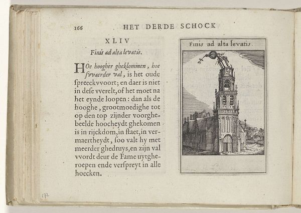 Editor: So, this engraving, "XXX Kruijt voor de wilde woeste," made in 1614 by Roemer Visscher. It looks like an open book, and on one of the pages, a depiction of books stacked on each other. There’s a somewhat somber, almost grave, feeling to the image, I think? What strikes you most when you look at it? Curator: The most striking thing to me is the potential tension between the power of knowledge contained within these books, and their vulnerability. Consider the sociopolitical context of the Dutch Golden Age – a period of immense intellectual flourishing alongside brutal colonial expansion. Is Visscher perhaps inviting us to consider how easily intellectualism can become a tool of oppression, a "herb for the wild, savage," as the title suggests, used to cultivate a specific kind of order? Who benefits from this cultivated order, and who is excluded or violently repressed in its name? Editor: That's an interesting way to put it, framing the image in terms of potential violence within society, not as wisdom bringing civilization, but civilization through violent cultivation. It makes me see it less as celebrating learning, and more as interrogating the potential darker implications of intellectual pursuits, a tool for domination rather than enlightenment. Curator: Precisely. Think about the visual language used here. The books aren’t neatly organized, they're piled haphazardly. The text references Plato, Aristotle, Seneca. Is Visscher commenting on the weight and potential chaos of inherited philosophical tradition when removed from real-world problems? Who had access to these ideas, and how did they influence society in practical terms, especially with regards to gender or racial inequalities? Editor: So, you're saying that the artwork’s true meaning only appears once we recognize it's embedded in social struggles, raising questions about access, oppression, and who gets to define “civilization” to begin with. Curator: Exactly! By questioning those in power through this artwork, can start looking closer into its intersectional implications for current gender, race and political theories.