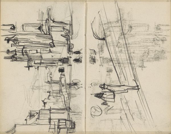 Curator: I find this work immediately intriguing. It possesses a rough, haunting quality that I am eager to learn more about. Editor: Allow me to set the scene. What we have before us is “Gezicht op Prinseneiland” a graphite and pencil drawing dating from between 1907 and 1909, created by the Dutch artist George Hendrik Breitner. It's currently held here at the Rijksmuseum. Curator: There's an almost brutal honesty in its unfinished quality, a snapshot rather than a constructed view. The sketch is rendered in a fleeting Impressionistic style, yet the harsh lines give it a feeling of isolation. What can you tell me about its context in relation to Dutch society at the time? Editor: Well, Breitner was known as the ‘painter of Amsterdam,’ drawn to the everyday lives of the working class. During that time, Prinseneiland was transforming—a bustling port undergoing industrial shifts, witnessing immense poverty but simultaneously facilitating Amsterdam's growth as a prominent harbor city. This drawing hints at that friction. Curator: And these quick marks capture something vital about transience. The symbol of canals evoke themes of connection and trade. The bare outlines allow the buildings and bridges to fade into fog. Is this related to cultural shifts Breitner was depicting? Editor: Absolutely. There's the argument Breitner was illustrating a new Amsterdam that no longer romanticized old structures. And in the background we see architectural forms evolving because Amsterdam was undergoing major infrastructural and societal shifts in the first decade of the 20th Century. His commitment to showing reality rather than beautifying aligns him with naturalist literature, part of a larger questioning of values. Curator: Thank you, knowing more of the historic significance provides meaning beyond the formal qualities, which opens a cultural dialog of old meets new. Editor: A culture in the raw. Precisely what draws me to the work even now.