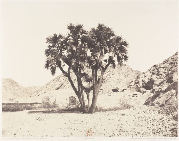 Editor: So, this is Félix Teynard's "Esneh, Dattiers, Sycomore et Café Sur le Bord du Nil" from around 1851-1852. It’s a daguerreotype, which is an early photographic process, right? It has this wonderfully serene feel. The large tree seems almost protective. What do you see in this piece, considering it's not just a landscape? Curator: Beyond its aesthetic qualities, consider the symbolism embedded within. The date palm, the "dattiers", has ancient associations with life and fertility in many cultures, from the Near East to North Africa. The Sycamore tree, too, carries powerful resonance, often linked to ideas of strength and longevity, not unlike a Bodhi tree. What do these choices, carefully composed, suggest to you about Teynard's intentions? Editor: Hmmm... Intentions. Well, I initially just saw a nice, peaceful scene, but with your comments about date palms being linked to fertility and the Sycamore linked to strength and longevity, I guess he’s saying something more. Do you think he was romanticizing Egyptian culture for a European audience? Curator: The gaze of early photography in this region cannot be divorced from its socio-political context. How much of Teynard's work is a recording, and how much a construction for a Western audience keen to consume exoticized imagery? The “cafe” included in the title, the specific staging…it speaks to Orientalist trends and cultural appropriation in the arts. The ruins of the village become a stage, the residents mere players. Editor: I didn’t consider that. The framing is really interesting now, with all that history in mind. It changes the whole dynamic of the image. I see a kind of visual record filtered through European eyes. Curator: Exactly. And, that intersection - the visible, historical symbols viewed through a colonizing lens – makes it incredibly compelling for a study of both art and cultural memory. Editor: Well, this has certainly given me a lot to think about! I came for art, and discovered an amazing study of power.