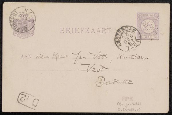 This "Briefkaart aan Jan Veth" was made with paper, ink, and a printing press. The artist, Chap van Deventer, created this piece in a time when postal communication was becoming increasingly standardized. The card itself is a simple rectangle, mass-produced. What makes it interesting, though, is how Deventer uses the ready-made format. The writing is in a flowing script, almost a performance of handwriting. The postmarks and stamp, normally just functional elements, become part of the composition, layered into the card's visual history. The card embodies a moment in the history of communication, where personal expression met industrial production. The labor involved is distributed – from the factory workers making the paper to the postal workers delivering the message. This challenges our ideas about craft, moving it beyond handmade objects to encompass how we engage with mass-produced items in a personal way.