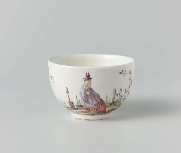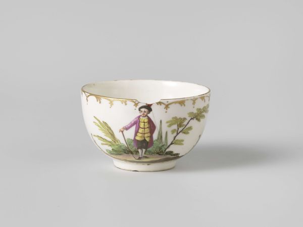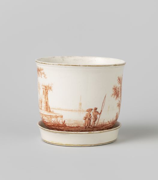 This porcelain saucer was made in Loosdrecht, the Netherlands, and is decorated with a delicate purple scene. The appeal of porcelain lies in its refined qualities: its smooth, white surface, its ability to be molded into intricate forms, and the crispness of its decoration. This particular piece showcases these qualities, highlighting the level of skill involved in both the making and the painting. The process begins with the careful preparation of the clay, followed by shaping on a wheel or in a mold. The piece is then fired at high temperature, and decorated before a final firing to seal the design. The decoration - a figure walking with their dog, is carefully painted by hand, indicating the level of craftsmanship and time involved in its production. The presence of this saucer speaks to the rise of a consumer society, where even relatively humble households could aspire to own beautiful, decorative objects. By appreciating its materiality and the human labor involved, we can see how ceramics like these have been historically undervalued, and how the history of craft is tied to the history of class.