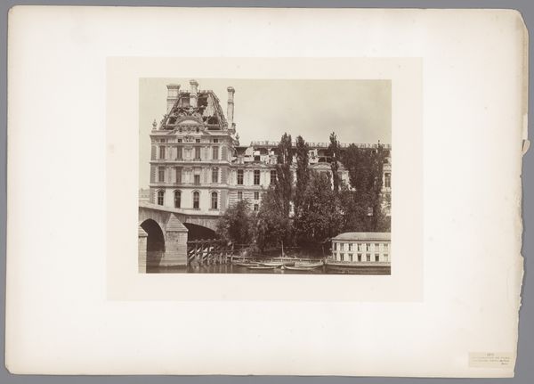 This photograph captures the Château de Versailles, with its vast courtyard, and was made in the early days of photography. The building itself stands as a potent symbol of power and authority, not unlike the ziggurats of ancient Mesopotamia, or the pyramids of Egypt. Observe how this palace, like those ancient structures, is designed to impress and dominate. The flags atop Versailles serve as declarations of ownership, reminiscent of ancient Roman standards planted in conquered lands. This act of claiming space through symbols has echoed through history, from medieval heraldry to modern-day corporate logos. Consider how the very act of building a grand structure is an assertion of control over the natural world. This ambition resonates with our deepest fears and desires, evoking a psychological tension between our primal instincts and our civilized aspirations. It invites us to reflect on the cyclical nature of ambition and the enduring human quest for dominance.