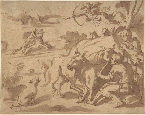 Editor: Here we have "Hunting Dogs Attacking a Deer" by Léon Davent, dating from 1540 to 1556. It's an engraving, so a print. It's such a violent image, but also very dynamic. What strikes you about this piece? Curator: Its depiction of violence certainly reflects the socio-political structures of the Renaissance. Hunting, particularly for deer, was a privilege of the aristocracy, visually asserting dominance not just over nature, but also reflecting their hierarchical control over society. Editor: So the hunt is more than just putting food on the table? Curator: Exactly. Consider the distribution of this print. Who would have owned it? Who would have commissioned it? Probably members of the upper class, solidifying their own status through ownership of such imagery. The image then serves as propaganda, of sorts. It also invites contemplation about who can exert such force over the natural world. Notice the detail in the dogs versus the more generalized landscape in the background, implying a certain hierarchy even in the visual elements. What does that suggest to you? Editor: It seems the focus is really on the power and drama of the hunt itself. The setting feels secondary. I hadn't considered how the mere act of depicting the hunt itself bolstered the societal position of the elite. Curator: And consider how this image may have been displayed, reinforcing that power to viewers within their social circles. That contextual understanding is essential to understanding Renaissance art beyond just aesthetics. Editor: I hadn’t thought about it like that. Now I see the image functioning as part of a bigger cultural narrative.