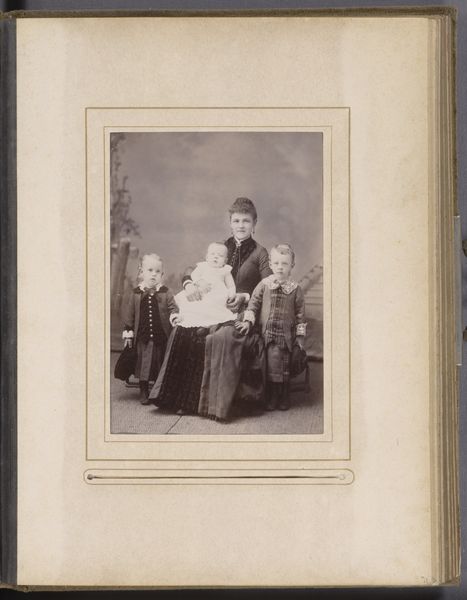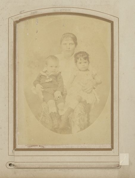 Curator: Before us, we have a photographic print titled "Portret van een moeder met twee kinderen," roughly translated as "Portrait of a mother with two children," attributed to Obbema & de Bruin, likely taken between 1880 and 1900. The photograph itself is printed on paper. Editor: What strikes me immediately is the seriousness of the composition, a mood evoked by the subdued tonal range, the somber expressions of the subjects, and the framing device, almost funereal in its oval form. Curator: The tonality creates an intriguing network of connections between the subjects’ attire, the background and even the cardboard on which it has been attached. It seems quite intentional to provide a connection and unification throughout the visual plane. Note, also, the very controlled distribution of light; soft but deliberate, it enhances textures but never reveals any hard detail. Editor: There's also an almost unsettling stillness about the figures. The mother's steady gaze, the children posed almost as miniature adults…It reminds me of earlier religious iconography, where figures were presented in a very staged and deliberate manner. Is it invoking Madonna-like symbolism? Curator: Undoubtedly, one can perceive resonances of those iconographic traditions. Yet, equally significant is the framing itself, with its tight oval compressing the subjects, contributing to the overall mood. This particular studio, Obbema & de Bruin, shows great care in structuring the piece, even down to the positioning of the younger child being placed firmly in his mother’s arm. The light emphasizes this. Editor: The clothes have significance, too, don’t you think? Those pristine white dresses on the children speak of innocence, but also perhaps hint at status within their society. They are placed on what seem to be steps, giving an odd hierarchy in the context of a home environment; the higher place for the woman suggests that her position as a parent is something that puts her above the two offspring. Curator: Indeed. And let’s appreciate how, even through the seemingly limited tonal range, textural variation comes through: the folds in the fabric, the curl of the child’s hair. It elevates what could be a simple portrait to a carefully considered arrangement of forms. Editor: So, what begins as an unassuming portrait reveals deeper layers of cultural echoes, visual construction, and the inherent gravity of capturing a family moment in time. Curator: A striking study in how light, form and composition elevate the emotional weight within an intimate scene.