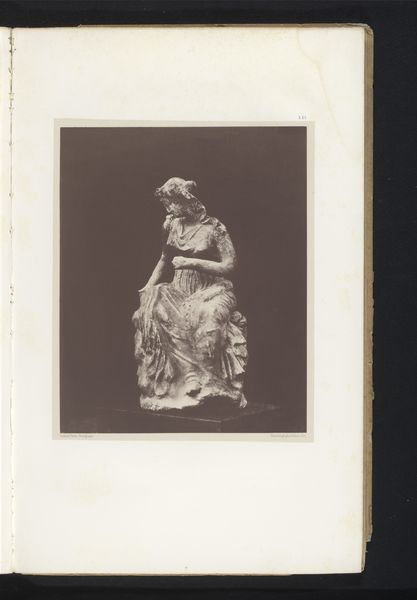 Curator: The work before us is from around the 1870s. It is a silver print photograph entitled "The Madame B Album," currently held at the Art Institute of Chicago. Editor: What strikes me immediately is the theatrical presentation; the heavy frame, almost baroque in style, and then the jaunty yellow bow, so deliberately positioned at the top. It’s all a bit performative, don't you think? Curator: It absolutely plays into constructed identity. During this period, portrait photography allowed individuals, particularly women, to craft very specific representations of themselves for public consumption. It's worth considering what image Madame B wished to convey, and to whom. The trappings of wealth are evident but subtly displayed, more so the quiet confidence. Editor: And that confidence is accentuated by her almost severe expression. But let’s return to the frame itself; all that dense ornamentation seems almost intended to communicate societal importance, reflecting a specific social stratum. Are the particular symbolic elements known to us? Curator: Unfortunately, the specific symbolic elements are unclear; without understanding her specific references it is hard to interpret the full context. What we can look at is her role as the woman sitting in the image and the album overall. There were several ways in which nineteenth-century women created and reinforced their position within family and society. This was done through images of family, properties and of course themselves. Editor: It's a reminder that while a single photograph can freeze a moment, its significance is rooted in a much larger flow of visual and cultural dialogue. This piece invites us to examine the complex relationships between portraiture, identity and the historical construction of gender. Curator: Indeed. And seeing the care with which these album pages were assembled serves as testament to the photograph's emotional weight; each choice offering nuanced insights into individual agency within broader social currents. Editor: For me, it underscores how symbols operate beyond the easily decoded. The yellow bow could suggest fleeting joy or could even signal something completely hidden. Ultimately the mystery becomes integral to the image.