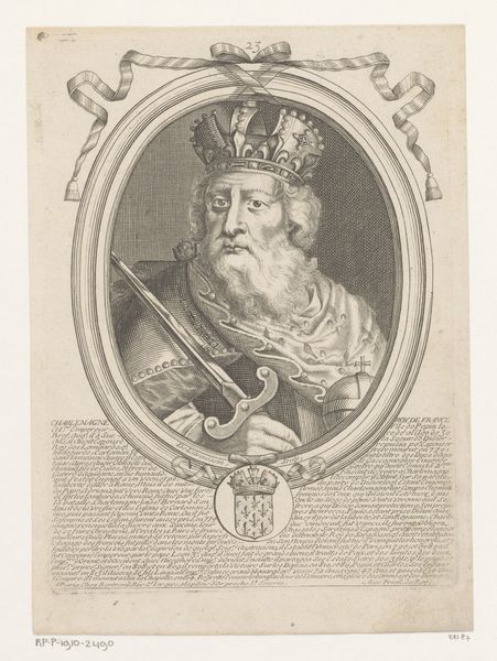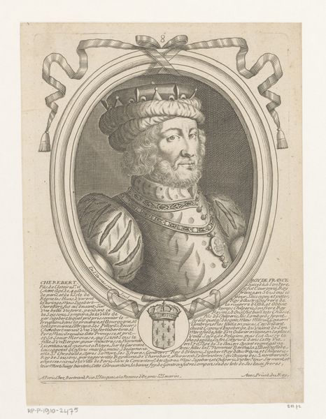 Nicolas de Larmessin I created this print, *Portret van Lodewijk de Stamelaar*, sometime between 1632 and 1694. Larmessin was one of a dynasty of prolific printmakers during the reign of Louis XIV, and his portraits were often aimed at celebrating and immortalizing prominent figures. This portrait depicts Louis II, known as Louis the Stammerer, King of France. It presents a vision of power and authority. Yet, it also prompts a reflection on the construction of masculinity and leadership through visual representation. Louis’s story is one marked by physical and possibly mental weakness, which sharply contrasts with the strength often associated with kingship. Larmessin attempts to merge Louis’s physical presence with the symbols of his authority. Consider how Larmessin navigates the tensions between Louis’s actual capabilities and the symbolic demands of his role. Does the portrait succeed in conveying power, or does it reveal the vulnerabilities inherent in inherited power?