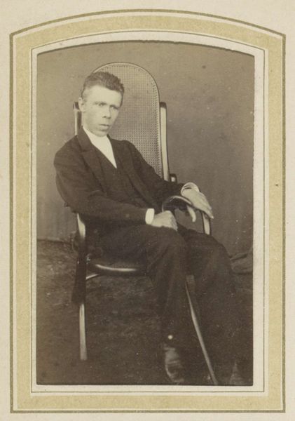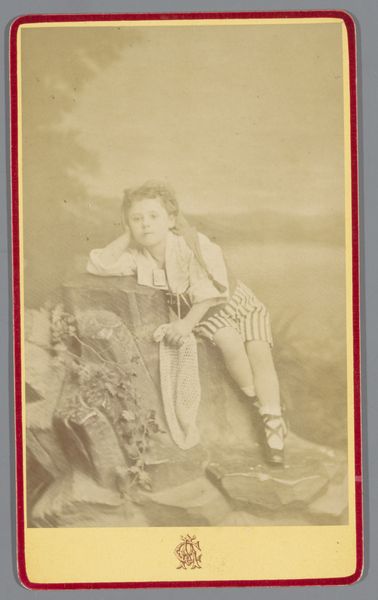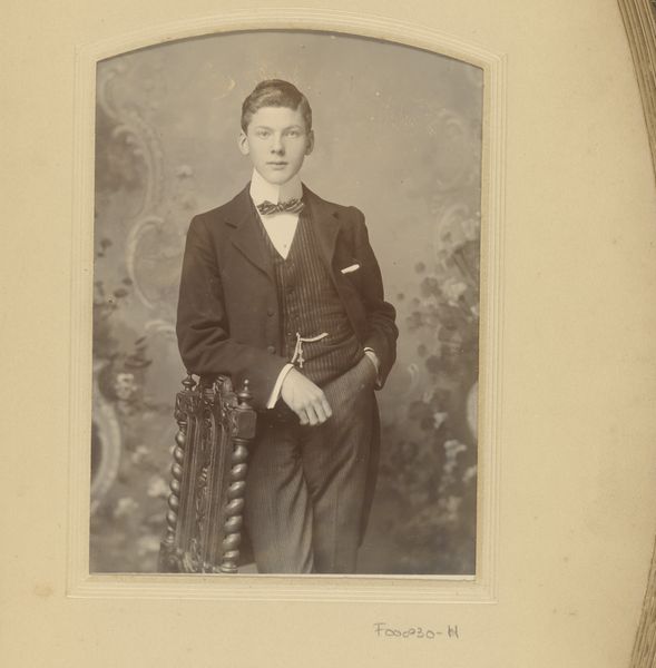 Curator: What a remarkably preserved image. Here at the Rijksmuseum, we have a photograph titled "Portret van David Williams op 11-jarige leeftijd," attributed to The Van Dyck Studios and believed to have been created sometime between 1880 and 1920. Editor: My first impression is of formality tinged with youth. He's dressed so meticulously, but there's still an innocence in his expression that the severe pose can't quite conceal. Curator: It certainly captures a specific societal expectation for young boys of that era. Notice the tweed suit; it suggests a certain social standing, indicative of the Victorian or Edwardian emphasis on class and outward presentation. Editor: Absolutely. And look at the patterned handkerchief he holds. It seems insignificant, but those small, deliberate details in portraits often carry a psychological weight. What message do you think that conveys, beyond mere etiquette? Curator: That's an insightful question. Handkerchiefs at that time had intricate social uses, indicating hygiene, courtship and status, but that one, to me, whispers a story of control and decorum in the late 19th century photography as it tries to navigate childhood in an era of industrialization. Editor: Yes! Almost like a physical representation of learned social behavior. Consider the geometric decorative framing also – I read those symmetrical details like emblems. Order and symmetry are projected as the defining traits that must surround his development, culturally speaking. Curator: I agree, even the soft focus technique lends it a sentimental glow. Pictorialism emerged partly as a rejection of straightforward documentation. These photographers weren’t just recording, they were curating a vision. It was not enough to represent one’s likeness but also how one ought to behave. Editor: This has an undeniable historical appeal. That intersection of the sitter's intended image versus his personal sense of self interests me the most. Thanks for sharing this one. Curator: Likewise. It highlights how photographic portraiture from that period serves both as an artifact of identity and a lens through which we can study social constructs of youth and status.