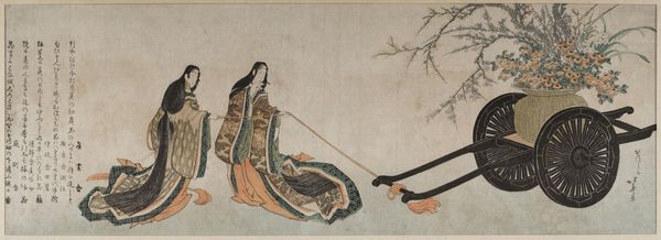 Editor: Here we have "Two Court Ladies Boating by a Blossoming Plum Tree," a book illustration by Kubo Shunman. The composition feels so serene, almost dreamlike. How do you interpret this work? Curator: The plum blossom itself is powerfully symbolic. In East Asian art, it signifies perseverance and hope, blooming even in winter. Notice how it frames the ladies, suggesting a cyclical renewal in their lives, despite the rigidity of court life. Do you see that too? Editor: Yes, I do. The blossom seems to offer them a form of escape, a moment of peace amidst the formality. I hadn't considered that. Curator: It suggests a rich cultural memory, connecting the viewer to centuries of tradition. Editor: I'll definitely consider the plum blossom differently now. Thanks!