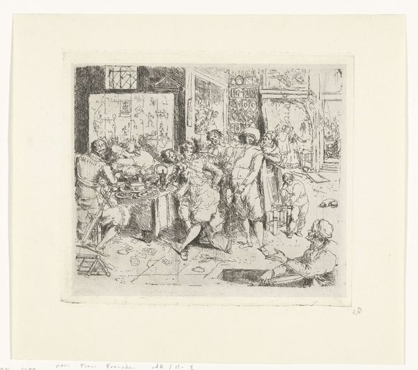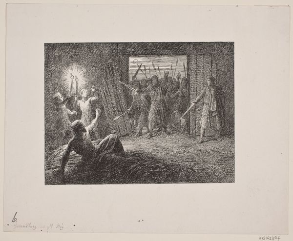 Editor: So, this is "Burgemeester Lancelot van Ursel geeft schepen Cornelis van Spangen het bevel over de burgerwacht", made after 1863 by Jean Baptiste Pierre Michiels. It's currently held in the Rijksmuseum. It looks to me like a really detailed print, maybe an engraving? There’s such a crowd of people, it’s almost chaotic. What strikes you most when you look at this scene? Curator: Oh, the delicious drama, right? This print... it sings of civic pride and perhaps a dash of impending doom. Think of it less as a photograph of a historical event, and more as a theatrical performance, carefully staged to evoke a specific feeling. The use of line, the cross-hatching to build up the dark areas - Michiels is really playing with light and shadow to direct our eye. He wants us to focus on the solemnity of the moment. Are these really preparations for the defense of the city? Is there an implied sense of threat in those pikes and armour? What feelings do those armaments arouse? Editor: It makes me wonder what they’re actually preparing for… a siege? Curator: Perhaps! Or maybe just a parade, or an overabundance of civic paranoia! This isn't straightforward realism; it's realism with a romantic flair, a touch of historical idealisation thrown in for good measure. It reminds me, these 19th century artists so loved re-imagining the Middle Ages, they made it darker and moodier, almost goth in their obsessions. You get a real sense that for them the past was a bit of an epic drama. Editor: That’s so true, a carefully constructed sense of drama! I hadn’t considered that. Thanks for pointing that out. Curator: My pleasure. It's always fascinating to look through the lens of one era and how it distorts another. A lot like how we probably see it now. It’s all one big echo chamber!