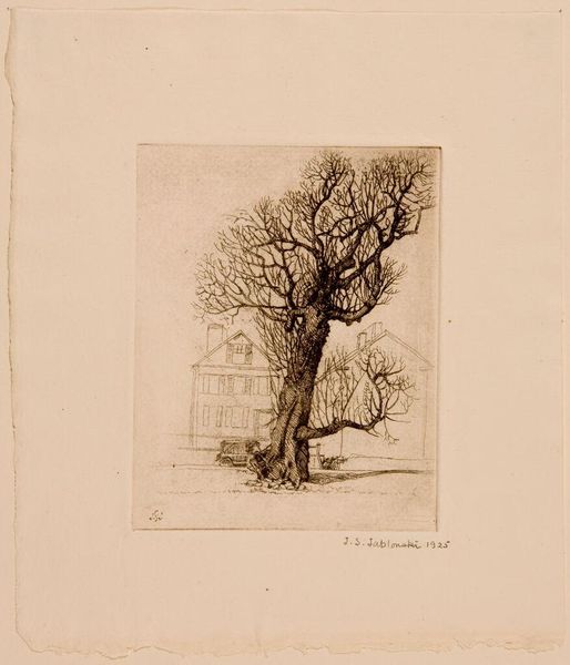 Editor: This is "In a Park, Trees, and Ruins" by Maxime Lalanne, etched sometime in the 19th century. The texture looks so intricate! What's your take on its composition? Curator: Consider how Lalanne employs a dense network of lines, a deliberate compositional strategy. Notice the stark contrast between the skeletal trees and the solid forms of the ruins. The lines themselves create the atmospheric perspective. Editor: So the strategic use of line weight defines the space and objects? Curator: Precisely. The varying density suggests not just form, but also light and shadow, ultimately constructing the image's emotional depth. What do you make of this technique? Editor: I see it now! It’s not just a picture; it’s a study in how line can create a world. Curator: Indeed. Lalanne masterfully uses line and contrast to evoke a sense of melancholy and reflection.