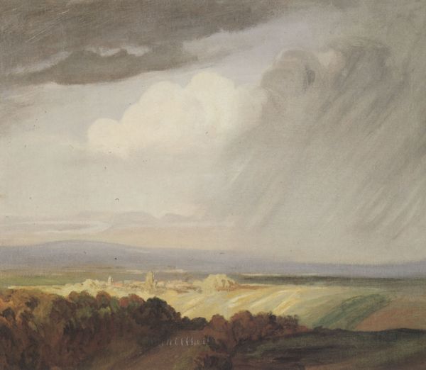 Curator: Ah, the promise of a downpour. Jean-Baptiste-Camille Corot painted this oil on canvas, "Wooded Plateau, Fontainebleau" around 1840. It's part of a private collection, a fleeting moment captured for posterity. Editor: Immediately, it strikes me as both calming and vaguely ominous. That sky, heavy with cloud, contrasts so starkly with the textured foliage. What I am observing here is the sheer breadth and scope of our world’s unvarnished panoramas. Curator: Corot was pivotal in transitioning from academic landscape painting to something far more immediate and observed. He, along with others, took to painting en plein air – outside, directly from the landscape itself. No filters. Just seeing. Editor: And it's not just documentation; it's interpretation, right? There's a romantic sensibility in that diffuse light, almost melancholic. It's more than topography. It seems more of a mirror reflecting on his inner experiences out on location painting at that time. It is indeed, deeply human. Curator: Absolutely. And Corot was at Fontainebleau regularly during this period, becoming well known among the community of painters in this royal forest located southeast of Paris. Fontainebleau wasn’t just a beautiful place, it was becoming a center, and school, of artistic study itself. Editor: Considering all those assembled artistic influences and communities that were coming to prominence at this time—how do you situate Corot, with all those movements burgeoning at once? Is it Realism, is it Romanticism? Both? Neither? It's difficult to affix. Curator: The Hudson River School had its parallels and overlapping years, absolutely, and a Romantic impulse is visible within both movements for sure, although Corot was working earlier, of course. We’re pre-Impressionism, in that crucial transition phase—but looking hard and without affectation becomes ever more important. Editor: It’s also, now that I think about it, so painterly. Those thick brushstrokes and earth-tone pallette build a real texture that invite you to explore the feel and appearance. It also strikes me as such an intimate piece, that heavy sky adding a profound element of contrast. Curator: In his day Corot’s artistic stance, capturing direct observations and atmospheric affects would have stood in contrast to any grand or staged depictions of land or nature. We feel the dampness, we smell the trees and grasses. Editor: Ultimately, a glimpse into a singular consciousness trying to put itself onto canvas in conversation with nature and all its fleeting mysteries. I admire his openness, truly!