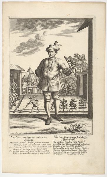 Curator: This engraving, "Portret van Jan I van Holland," dating to before 1725, depicts Jan the First, Count of Holland. What stands out to you upon seeing it? Editor: Immediately, it's the linearity—the meticulous rendering of texture through those fine lines. The cloak’s fur trim and even the way light catches the armor in the bordering design—the engraver clearly revels in detail. Curator: The engraving showcases not only the Count himself, but also embeds him within symbols of governance and authority, and reflects ideas about powerful historical figures. Note the border, filled with martial emblems. These weren't mere decoration; they served to reinforce the subject’s status. Editor: I am fascinated by the composition. Jan I stands centered but his gaze lowers which subverts any attempt to suggest absolute authority, even while holding a sizable sword. How intentional are we reading his stooped shoulders? Is that an acknowledgement of something about the man himself or simply an artifact of style at the time of the engraving's creation? Curator: Engravings of this sort had a vital role. Before widespread photography, printed portraits disseminated likenesses of important figures, and in so doing, solidified power. Jan I had died long before this print was made. So, this image isn't necessarily meant to be representational. It reminds viewers of a historical legacy, connecting the present with the past and also alluding to political circumstances from when it was made. Editor: You can certainly sense how prints served as vehicles for visual messaging during this time. I find that the decorative setting which includes ominous symbols such as the skull also communicates meaning, reminding viewers of a world where ideas about living a virtuous life were highly prized. The skill in rendering light is, admittedly, excellent. It’s as though we have a graphic play—black ink upon the stark white, like a staged performance of chiaroscuro that pulls our gaze inward. Curator: Indeed. By examining prints such as this one, we start to perceive not only artistic but social functions. Works on display in institutions, collected, and exhibited send us very specific ideas. Editor: Precisely, we gain insight by considering the formal language the artist employed when choosing his materials. It is that artistic choice which grants insight and helps us analyze culture.