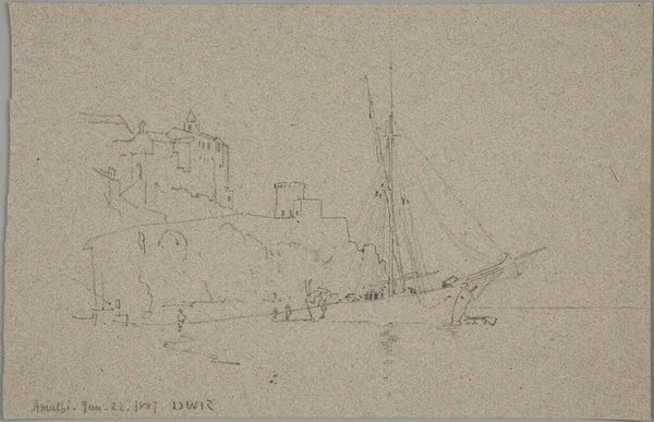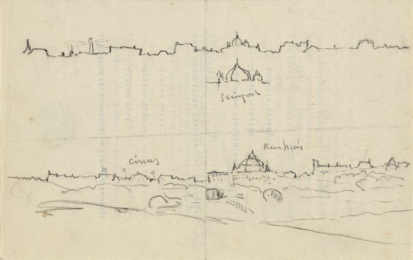 Editor: We're looking at "Gezicht op Het Singel met de Ronde Lutherse Kerk in Amsterdam," a pencil drawing on paper by George Clausen, dating back to 1875. It's so delicate, almost like a memory fading into the paper. What draws your attention when you observe this cityscape? Curator: The drawing exemplifies the formal qualities of plein-air Impressionism. Consider how the rapid, suggestive strokes of pencil capture the transient effects of light and atmosphere, not only upon the architectural forms but particularly on the water itself. Editor: It’s interesting how the dome and the tower anchor the composition despite the haziness. What about the line work? It seems almost unfinished in parts. Curator: Precisely. Notice the strategic use of hatching and cross-hatching to create tonal variations and model forms without resorting to continuous lines. The perceived incompleteness underscores the fleeting moment—a key concern of Impressionist practice. How do the contrasts in texture contribute? Editor: The roughness of the strokes makes it feel like a snapshot in time, not necessarily something meant to be perfectly representational. So it's not about accurate representation but rather the aesthetic experience itself. Curator: Indeed. Focus on the formal properties and the relationship of the forms with one another and the artist's hand becomes visible in the work itself. We get to consider drawing as both subject and medium. Editor: I never thought about it that way before. I appreciate how your analysis brings attention to the basic artistic considerations, not just a surface read. Curator: Observing the material construction of a work allows it to come alive in new ways.