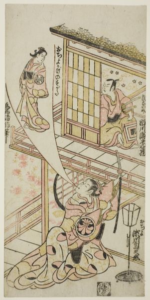 Editor: We're looking at "The Actors Segawa Kikujiro I as Nobutsura's wife Karumo and Otani Oniji I as Tahara Matataro in the play "Shusse Momijigari," made in 1747 by Torii Kiyonobu II. It's a woodblock print at the Art Institute of Chicago. I'm struck by the bold outlines and the contrasting colors. How would you interpret the composition? Curator: Notice first the flatness of the picture plane, a defining characteristic of *ukiyo-e*. The arrangement is decidedly graphic. Kiyonobu employs strong, curvilinear lines to define form. The dynamism comes not from chiaroscuro modeling, but from the expressive contours and the patterned surfaces of the kimonos. Note the controlled palette; green and muted earth tones are offset by the actors' bare flesh, unifying the diverse elements. Editor: It's interesting you point that out, I noticed how the color choices gave off an understated sense of depth despite the piece being so obviously flat. What else catches your eye? Curator: I am intrigued by the architectural framing – the clean lines of the building set against the organic form of the maple tree, hinting at both constraint and freedom. Ask yourself what effect this contrast has. Also, consider the positioning of the figures in relation to one another and to the viewer; what is implied in the visual construction of the print? Editor: So, the composition itself, the formal arrangement of shapes and lines, becomes the language through which we understand the narrative and cultural meaning of the print? Curator: Precisely. The artist creates meaning by carefully manipulating the visual elements, independent of historical or social context. We can read it as a visual problem elegantly resolved through balance and counterpoint. Editor: I'm starting to appreciate how much information is conveyed just through the structure and forms in the work. Curator: Yes. Reducing our reliance on the external helps refine how we appreciate the work.