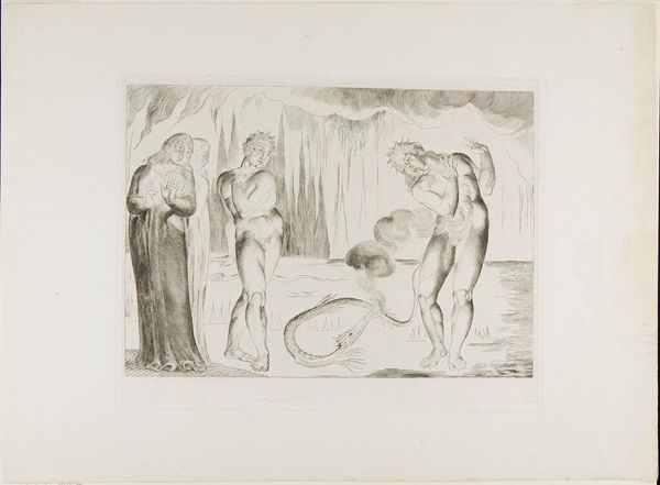 This is William Blake’s engraving, "The Circle of the Thieves; Buoso Donati Attacked by the Serpent," now at the Metropolitan Museum. The composition is stark; the scene unfolds with a dramatic intensity conveyed through Blake's meticulous use of line and form. The figures, rendered with pronounced musculature, evoke a sense of tormented energy, a visual embodiment of Dante’s inferno. Blake’s focus on the human form allows him to explore themes of transgression and punishment. The serpent, rendered with sinuous lines, coils around Buoso Donati, symbolizing the inescapable consequences of deceit. The stylized lines of the landscape further amplify the emotional tension, creating a sense of claustrophobia. Ultimately, the print destabilizes traditional representations of morality, inviting viewers to reflect on the complexities of human nature. The artwork prompts a critical examination of moral structures and invites contemplation on the fluid boundaries between virtue and vice.