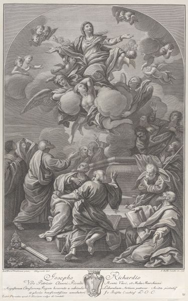 Editor: Here we have Cornelis Cort’s "Annunciation, Surrounded by Prophets, Left Part," an engraving from 1571 currently residing in the Rijksmuseum. There's so much going on here. At first glance, I'm struck by how crowded it is and how the figures seem to float. What do you see in this piece? Curator: It’s positively bursting, isn’t it? I’m drawn to how Cort marries the earthly with the divine. Prophets anchor the composition at the bottom, almost like pillars, while above, a swirling celestial scene unfolds, filled with angels and light. Do you notice how Mary seems almost separated from this dynamism, set slightly apart in the lower right? Editor: Yes! She almost looks contemplative or even a bit sad, compared to the flurry of activity elsewhere. Why would Cort do that? Curator: It creates a visual and emotional contrast. The engraving captures the moment *before* Mary accepts her role. She's caught in the quiet before the storm, the calm before transformation, as the engraving suggests she dwells in shadow, whereas the remaining picture erupts in light. Notice how her relative darkness invites the eye to return to the brilliance surrounding the Annunciation itself? Editor: That’s a really interesting way to put it. I was so caught up in the crowd of figures, I almost missed the subtlety of Mary’s pose and placement. And the sleeping figure at the top left—what is that? Curator: Ah, a philosopher perhaps, lost in slumber. It underscores the idea that divine truth is revealed not through reason, but through faith and acceptance. Perhaps even our own blindness and deafness when confronted with that truth. The more you look, the more these elements come alive, each little pocket of artistry creating a layered and deeply personal vision of something miraculous. Editor: It’s incredible how much detail he fit into one engraving. I definitely have a new appreciation for its complexity. Curator: Absolutely! Each figure holds significance, each line contributes to the narrative. It's a beautiful reminder of the power of art to translate faith and wonder.