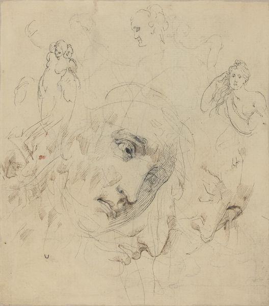 Editor: Here we have Woutherus Mol's "Schets van een beeldje van een zittende naakte man," a pencil drawing that probably dates sometime between 1795 and 1857. I'm struck by the contrast between the rough, almost frantic lines of the female figure’s face, versus the more carefully rendered sculptural nude. What's your perspective on how the composition functions? Curator: Precisely. Let us observe the deployment of line and form. Note how the artist uses hatching and cross-hatching to build up tonal values in the nude, creating a sense of volume and depth. This contrasts significantly with the more fleeting, suggestive lines defining the female head. Do you perceive how the placement of the figure directs the eye? Editor: Yes, the male figure anchors the composition in the upper left corner, and my eye then travels across to the head. It feels almost like a study in contrasts – finished versus unfinished, sculptural versus planar. Curator: Indeed. Consider the formal properties. The artist orchestrates a dialogue between solidity and ethereality. What meaning do you draw from this opposition, or is meaning even the relevant question? Is this study more about contrasting line qualities, or probing states of being? Editor: It's true, it may not be about concrete meaning. Focusing on the forms, I now appreciate the artist’s technical skill, his control over line and shading, and the subtle variations in texture he achieves with simple pencil strokes. Curator: Precisely. Our exercise underscores the merit of visual scrutiny. It allows a far more rewarding and granular response to line, light, and volume, wouldn't you agree? Editor: Absolutely. Thinking through your approach, I learned it's less about what the sketch depicts, and more about *how* it does. Thanks!