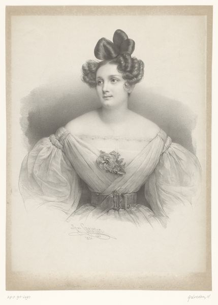 Curator: Gazing upon this, I'm immediately transported to the Romantic era! The subject is "Mlle. Noblet" rendered in lithograph on paper by Henri Grevedon around 1829-1830. What are your first thoughts? Editor: Flowers. My immediate feeling is an over-the-top abundance of florals on her head. Is it just me, or is there something theatrical, maybe even performative, about this portrait? Curator: Absolutely. Given its creation within the Romantic style, we observe elements of the dramatic. It is a portrait, after all, intended for display. The abundance you've noted is less about mere decoration and more akin to emblematic assertion. It speaks of Noblet’s status, particularly in Parisian theatrical circles. Floral wreaths have long symbolized victory, achievement, even a saintly halo in older religious contexts. Editor: Ah, so it's a kind of visual vocabulary? I love the contrast between that explosive floral arrangement and her relatively reserved gaze. There’s a story in that contrast alone, don’t you think? The public persona versus the private self, writ large in ink. Curator: Precisely. Grevedon keenly understood the dual aspects of public identity and inner experience. The choice of lithography enhances this delicate balance as it captures a tonal range that breathes life and softness into her expression. Consider the use of shading around her eyes, for example. It subtly deepens the emotional resonance of the piece. Editor: It almost humanizes her. I imagined these portraits served something of a PR function in their day, but in emphasizing these fine features of Mlle. Noblet's face, the artist evokes intimacy. Curator: Indeed. And remember how printmaking made this kind of imagery more accessible, thereby extending the reach of Noblet's public presence but also solidifying visual markers for aspirations of success and refined grace. Editor: I'll never look at Romantic era portraits the same way again! It's so interesting to look closer and realize all the layers that a seemingly simple work can communicate about culture and personality. Curator: As with every worthwhile artifact of human expression, sustained contemplation yields its own treasure of understanding. Thank you for joining me.