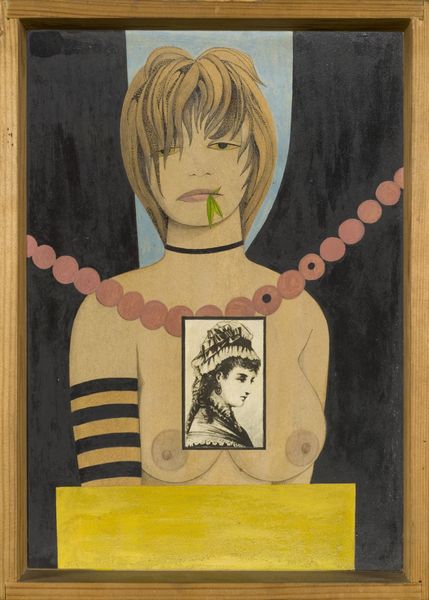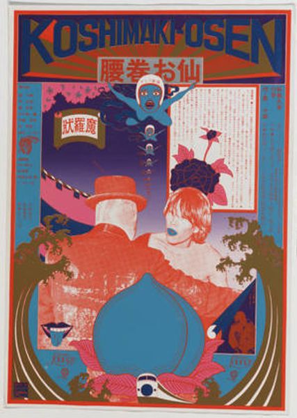 Editor: This is Tadanori Yokoo's "Koshimaki-Osen," a mixed-media collage and print from 1966. It's incredibly vibrant, almost assaulting the senses with its clashing colors and imagery. How do you interpret this work? Curator: It’s fascinating, isn’t it? Yokoo’s work is always a powerful statement. Consider the sociopolitical context of 1960s Japan. Post-war anxieties were clashing with burgeoning consumerism and a renewed interest in traditional arts like Ukiyo-e. This poster seems to reflect that tension. Editor: How so? I mean, I see elements of pop art but it feels very distinctly Japanese, if that makes sense? Curator: Precisely. Note the Ukiyo-e influences: the stylized waves, the flattened perspective. Now consider the bold, psychedelic colors and the fragmented composition reminiscent of advertising. He’s juxtaposing tradition and modernity, suggesting a culture in flux. Are there gender dynamics at play too, you think, especially with the figure of Osen, which literally translates to ‘woman wrapped around the waist’ or something similar? Editor: I hadn’t thought about it that way, but it's true—the figure of Osen and the juxtaposed peach are quite suggestive. Is Yokoo commenting on the objectification of women within this cultural collision? Curator: Absolutely. He uses this visual language to question established norms. This isn’t just a poster; it's a provocative critique. Editor: It’s amazing how much a seemingly chaotic image can convey once you start unpacking the layers. I see so much more now! Curator: Indeed! Art can be such a potent tool for social commentary and critical exploration, and Yokoo here is masterfully employing it.