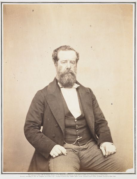 Curator: Let’s turn our attention to this photograph, “Portret van een onbekende man met baard,” dating from 1879 to 1882. It’s rendered on paper, employing photographic techniques characteristic of the late 19th century. Editor: It feels quite intimate, doesn't it? The subdued tones and oval frame concentrate attention. There's a definite weight to the materiality, a sense of historical gravity. Curator: Absolutely. The choice of photographic paper as a medium would have been quite deliberate, reflecting the socio-cultural perceptions of portraiture and individual identity. Editor: I am thinking of the labor of photography, of studios cropping up in cities providing portraits like this to an expanding middle class. The materials involved–the paper stock, the chemicals, the equipment, each stage a labor-intensive process with a commercial intent. Curator: The composition, in turn, seems consciously structured to emphasize the subject’s dignified presence, don't you think? Notice how the lighting softly models his features, lending a classical air? It adheres to conventions, really. Editor: Perhaps, but to me it reveals how early photographic practices were often rooted in the chemist's lab more than the artist's studio. We see the practical constraints imposed by early photographic technologies, influencing everything from pose to palette. Curator: A pertinent perspective. Considering its relatively small format, the photographic paper chosen allows for remarkably precise rendering of details. The fineness of the line, the textural variations achieved on a paper substrate - it adds an inherent, nuanced element of tangible, historical import. Editor: Yes, the tangible history held within the materials used – these processes and mediums speak volumes about an era and its evolving cultural norms and emerging consumerism. It's not just about art; it's about documenting a society at a turning point. Curator: Precisely, offering layered interpretations about not just portraiture, but self-fashioning itself. A material record. Editor: Indeed. These observations concerning this photographic portrait will enhance a deeper appreciation of not only its intrinsic value but of the time that framed its very existence.