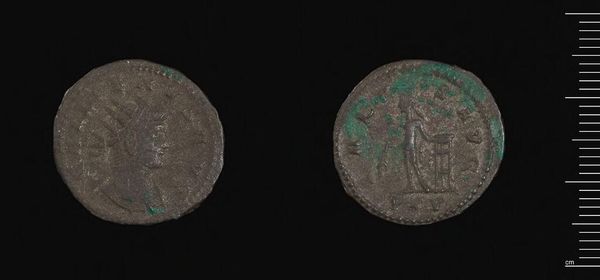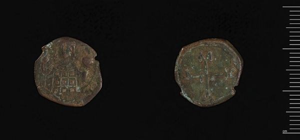 Editor: This is a Dodecanummium of Herakleios, Catana, by Abd-al-Malik of the Umayyads. The coin's material looks corroded and the imagery appears faded. What do you see in the arrangement of the lines and shapes etched on its surface? Curator: The deliberate placement of symbols on a circular plane offers a structured visual language. Note the stark contrast between the patinated metal and the shallow incisions. The circular form itself suggests wholeness, continuity, and perhaps even authority through its association with coinage. Editor: So, the coin's value isn't just monetary but also symbolic? Curator: Precisely. Consider how the lines and shapes interplay, creating a visual rhythm that aims to convey meaning beyond its face value. Understanding this formal structure is key to unlocking its artistic significance. Editor: I never thought of a coin as something to read in that way. Thanks!